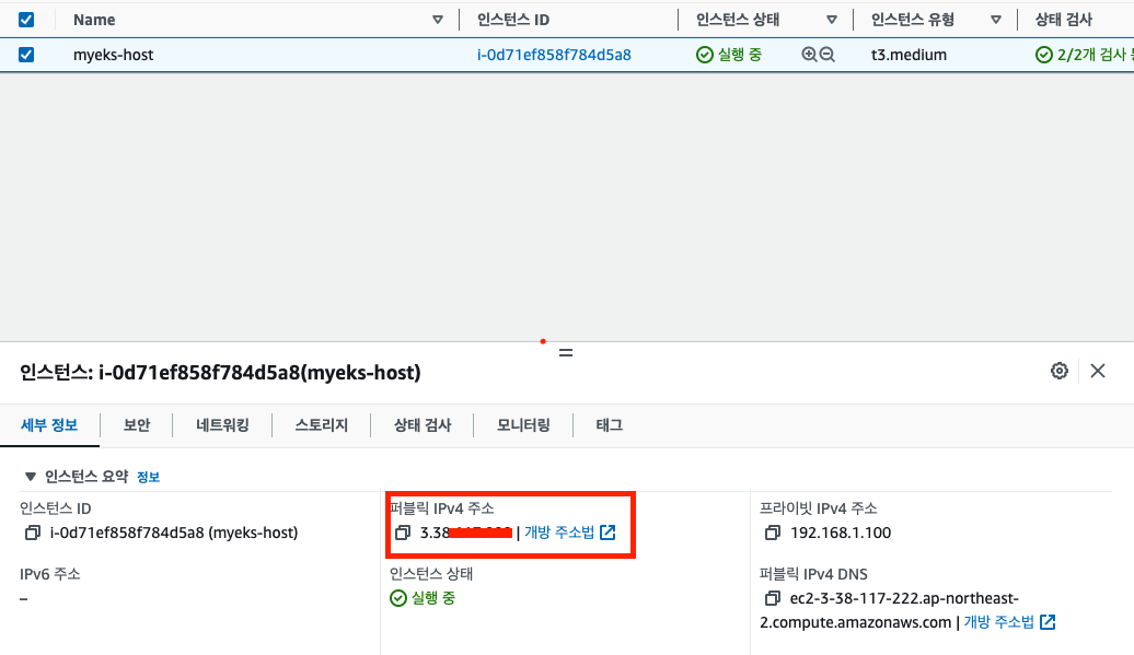EC2 메뉴에 접속하면 myeks-host 인스턴스가 생성된 것을 확인할 수 있다. 인스턴스의 퍼블릭 IPv4 주소를 확인하고 SSH를 통해 접속해보자.