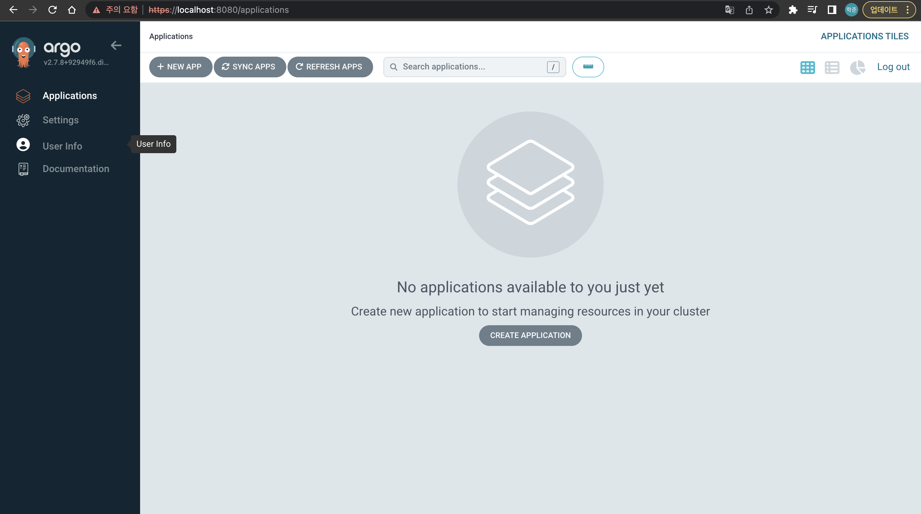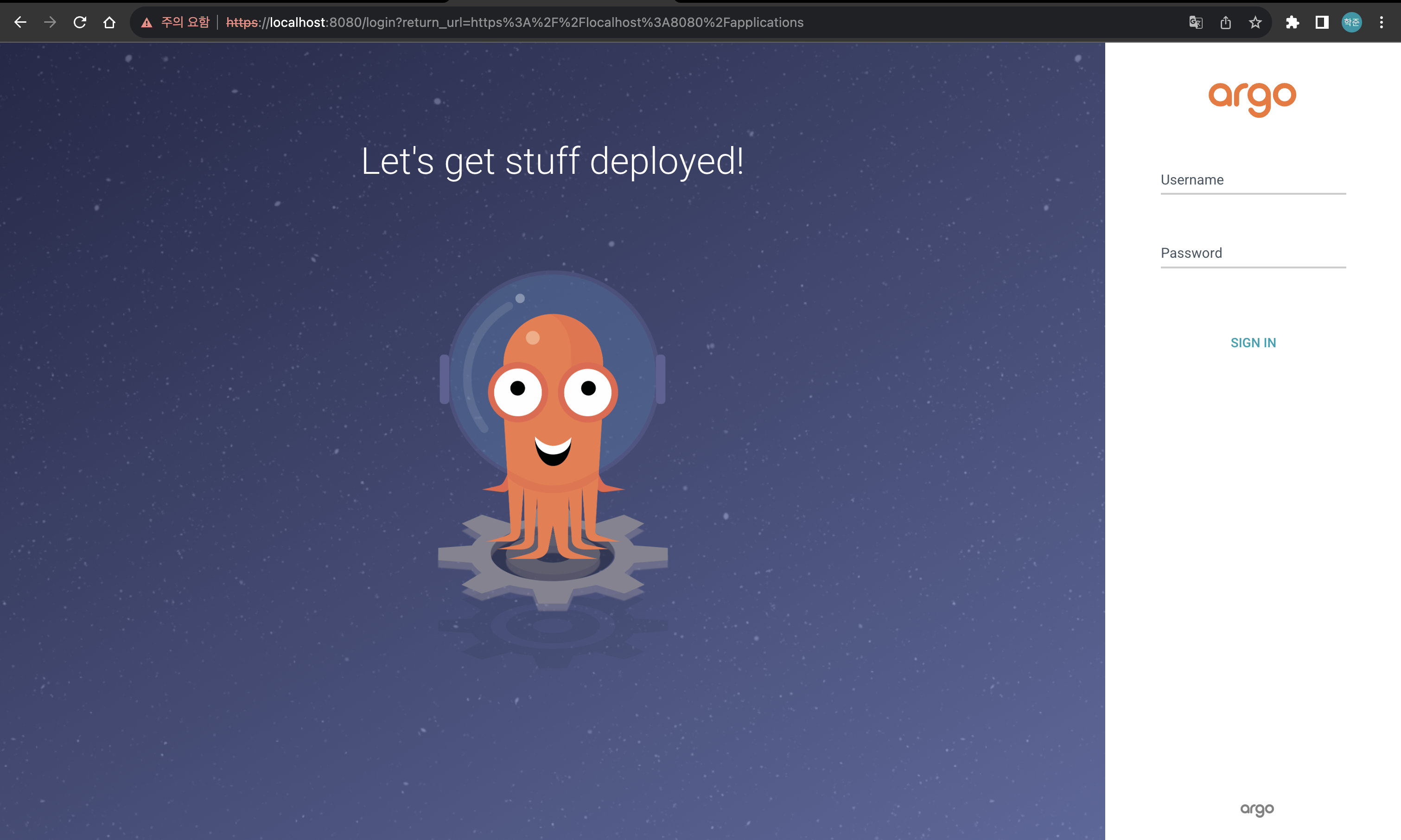 만약 Minikube, k3d등 Local 환경을 사용중이신 경우 Metallb 설정 혹은 주석 처리된 `kubectl -n argocd port-forward service/argocd-server 8080:443 &` 명령을 통해 서비스를 포트포워딩 해주시기 바랍니다.!