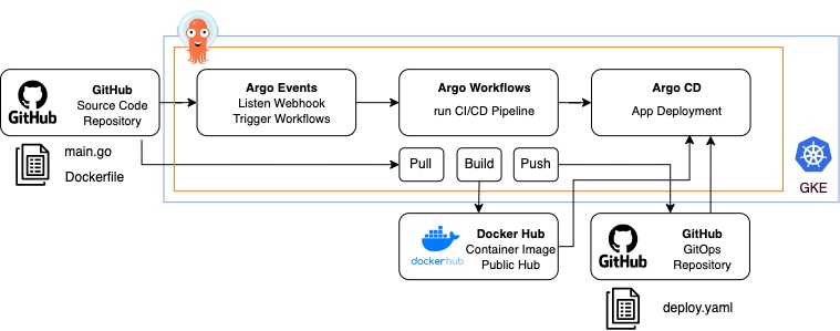 `Argo Workflows` : Argo Events로부터 Trigger된 Wrokflows는 Source Repository로 부터 Code를 Clone하는 Pull 단계, 그리고 그 코드를 기반으로 새로운 컨테이너 이미지를 빌드하는 Build 단계, 마지막으로 Argo CD가 바라보고 있는 YAML의 컨테이너 이미지 버전을 업데이트 하는 Push 단계로 작동합니다.