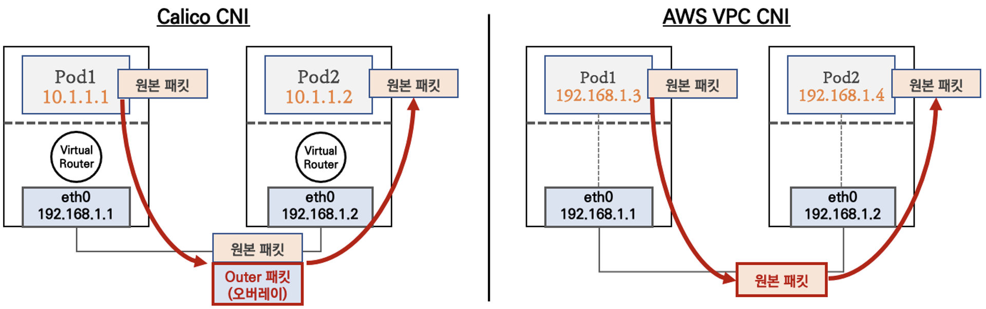 두 번째, 통신에 오버헤드가 줄어듭니다. 아래 그림에서 알 수 있듯이 기존 쿠버네티스 CNI는 오버레이(VXLAN, IP-IP 등)을 통해 다른 노드에 있는 파드와 통신할 수 있지만, 원본 패킷 위에 Outer 패킷이 존재 해야 했습니다. 하지만 AWS VPC CNI는 노드와 동일한 VPC 대역을 가지기 때문에 원본 패킷 그대로 다른 노드에 있는 Pod에 접근 가능합니다.