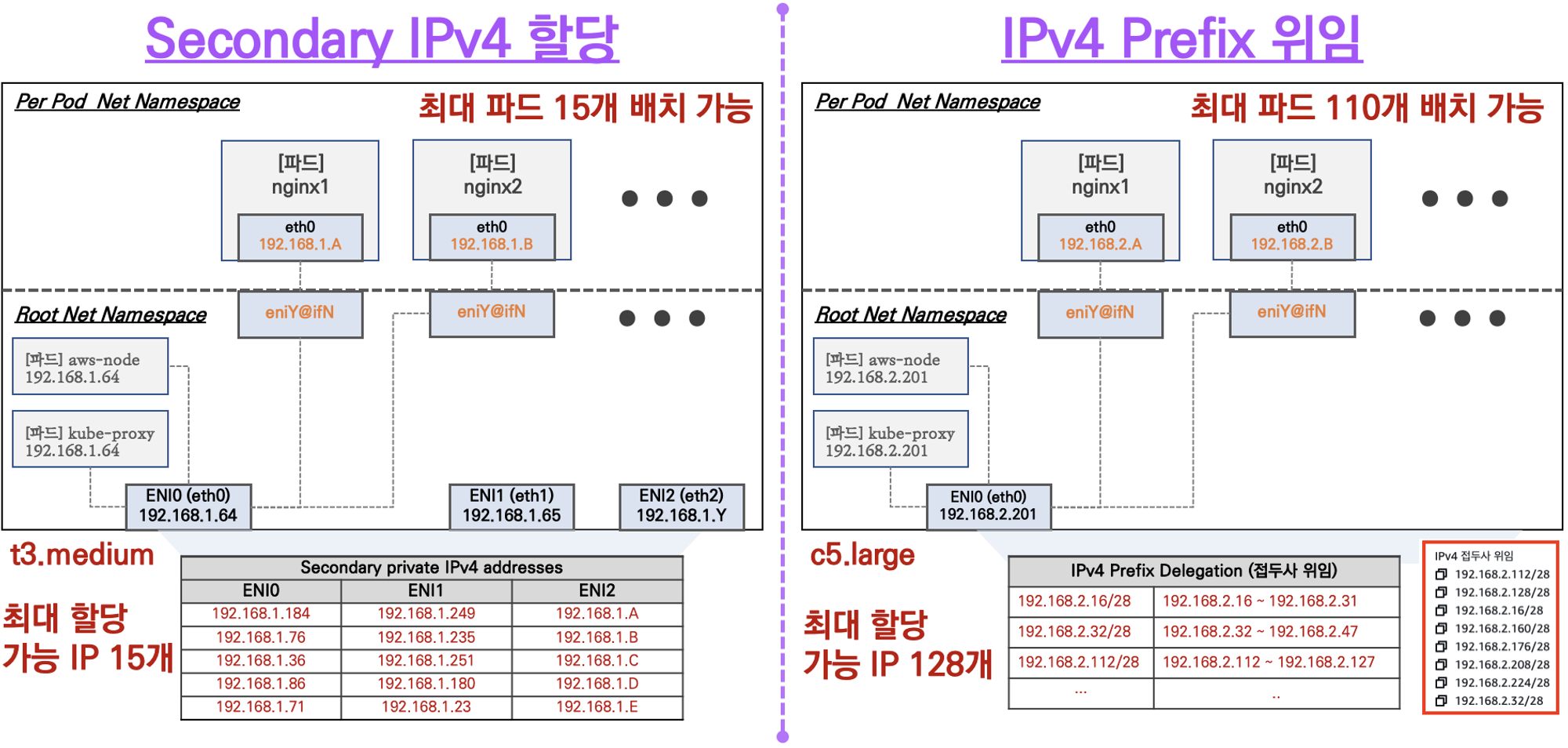 EKS의 워커노드 Network Namesapce는 Root, Per Pod 로 구분 됩니다. aws-node, kube-proxy 파드는 쿠버네티스의 호스트 네트워크 옵션을 사용해 EC2에 부착된 ENI와 동일한 Root Network Namespace를 사용하고, 파드의 IP도 노드의 IP를 사용합니다. 그 외 생성되는 파드들은 별도의 Network Namespace에 생성됩니다. 이를 구현하기 위해 워커노드에 가상의 네트워크 인터페이스를 생성하고 파드에 연결합니다.