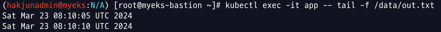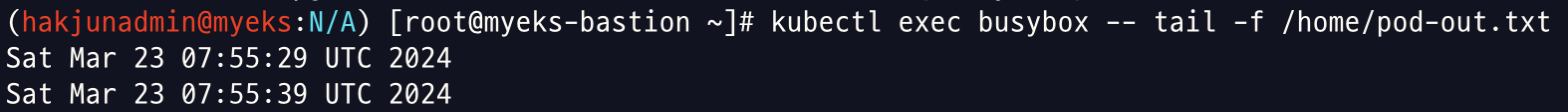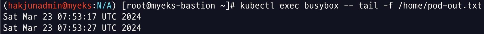kubectl exec busybox -- tail -f /home/pod-out.txt