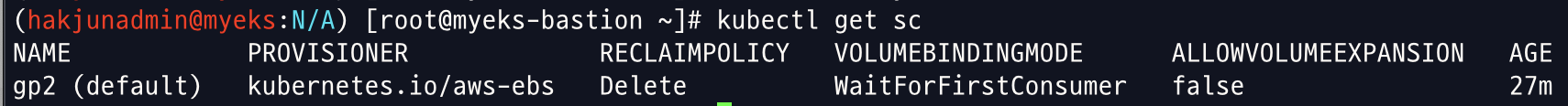 아래 명령어로 기본 스토리지 클래스를 확인합니다. EKS는 gp2 스토리지 클래스를 기본으로 제공합니다.