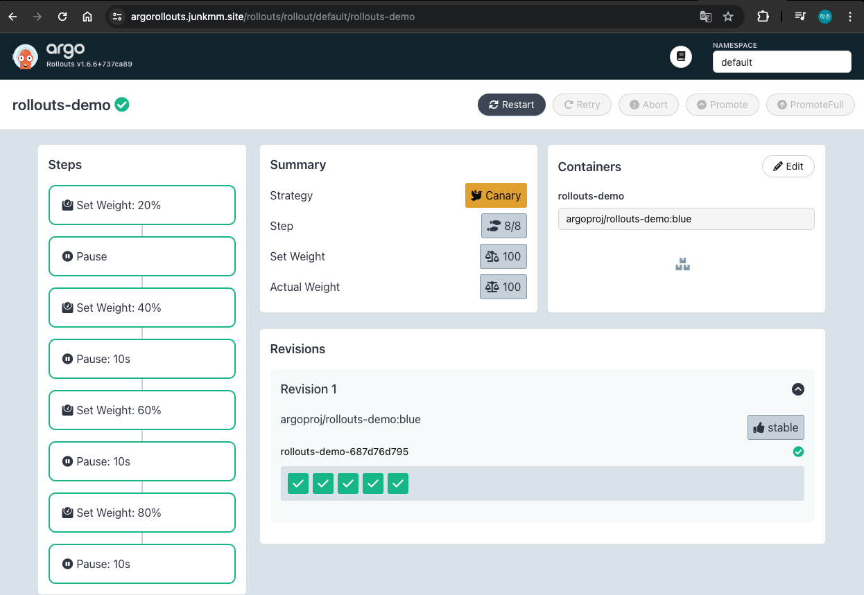 `https://argorollouts.junkmm.site/rollouts/default`에 접근합니다.