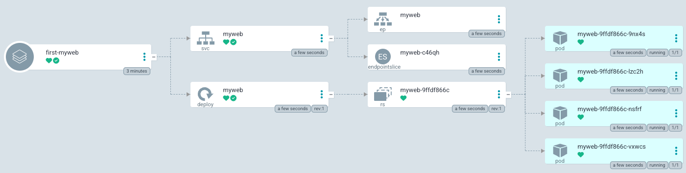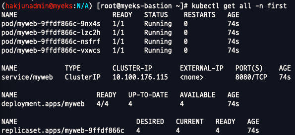 `kubectl get all -n first`로 조회 시 리소스가 조회된것을 알 수 있습니다.