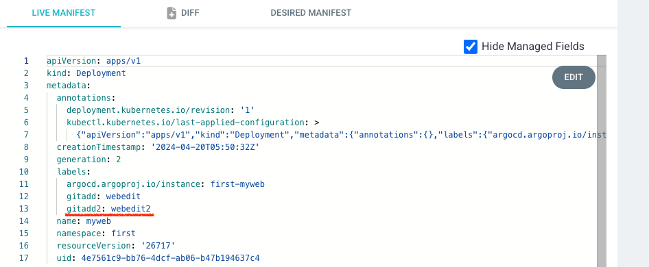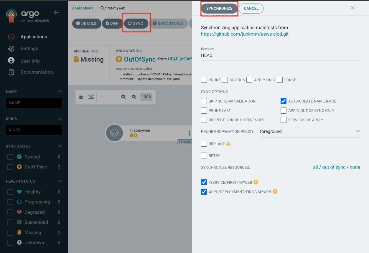Refresh를 누르거나 3분을 기다리면 Status가 OutOfSync로 변경됩니다. Sync를 누르게 되면 Git에서 추가한 labels가 반영된 Deployment가 배포 됩니다.