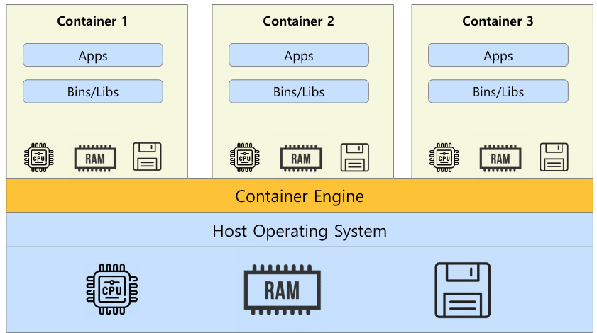 Host O/S 기반에 Container Engine이 컨테이너의 구동을 관리합니다. 컨테이너 엔진은 CPU, RAM, Disk자원을 컨테이너에 할당 시켜주고, 각 컨테이너를 격리하여 프로세스를 구동시킵니다. 컨테이너 엔진은 Host OS 위에서 동작하기 때문에, 컨테이너의 커널 사양에 따라 구동시키지 못하는 경우가 발생할 수 있습니다.