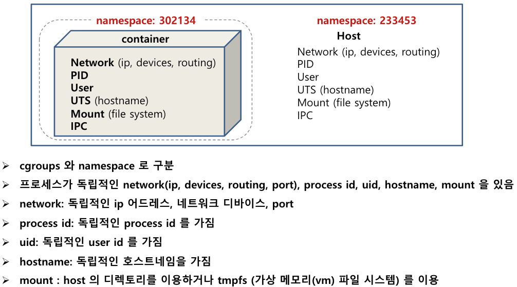 자원의 분배와 격리는 각 각 cgroup, namespace를 사용하여 구현합니다. 프로세스 단위로 격리시켜 컨테이너를 구동하기 때문에 컨테이너는 자신에 할당된 자원만큼만 사용할 수 있습니다. namespace에서 격리되는 자원의 정보는 다음과 같습니다.