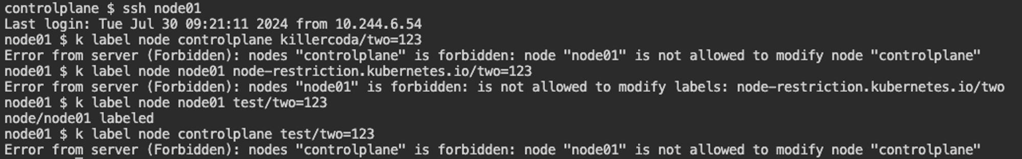 node01 $ kubectl label node controlplane killercoda/one=123 # works but should be restricted